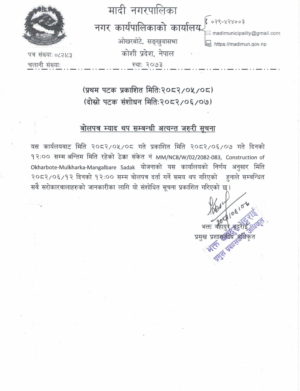 कInvitation for Bid: Construction of Okherbote-Mawadin-Nundhaki Sadak