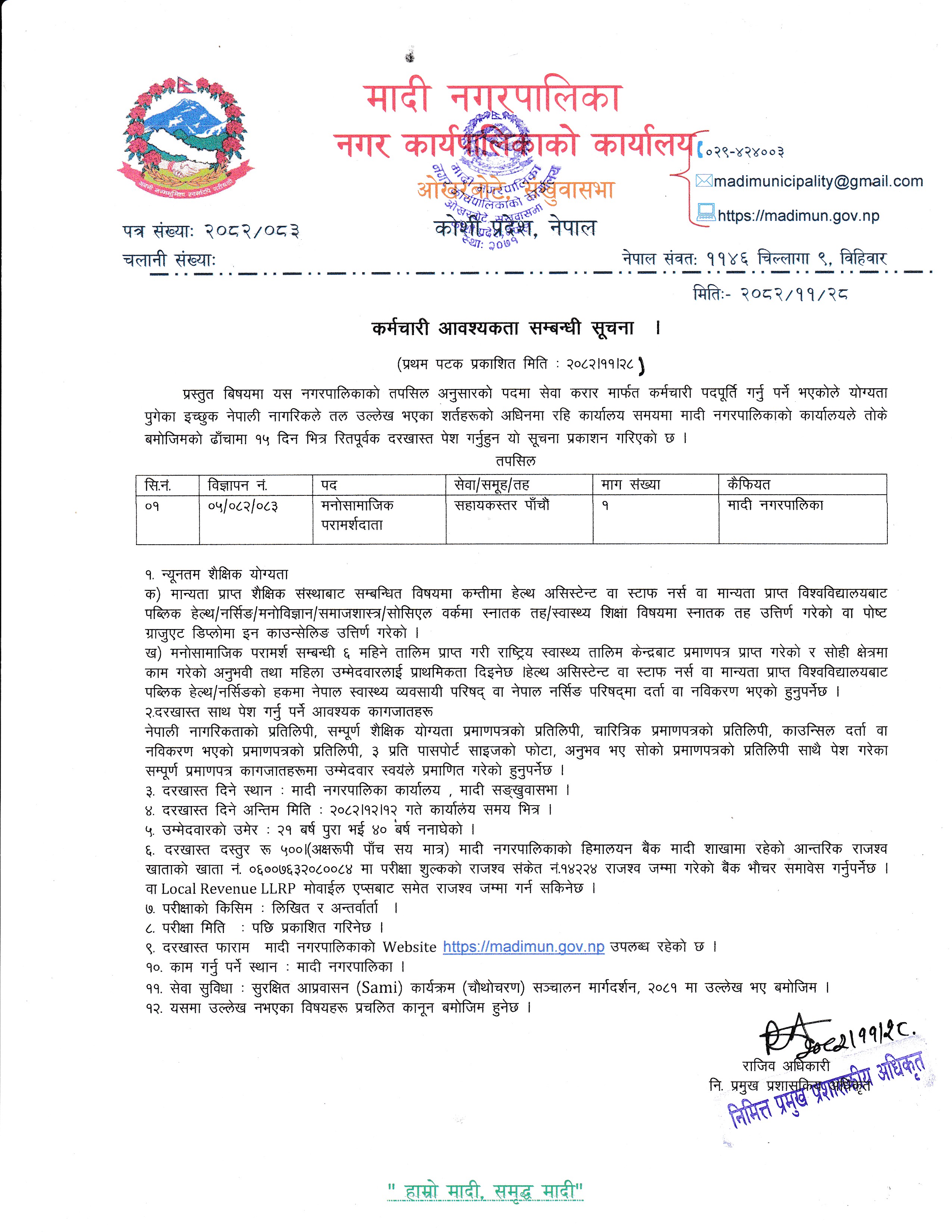 कर्मचारी आवश्यकता सम्वन्धी सूचना ।