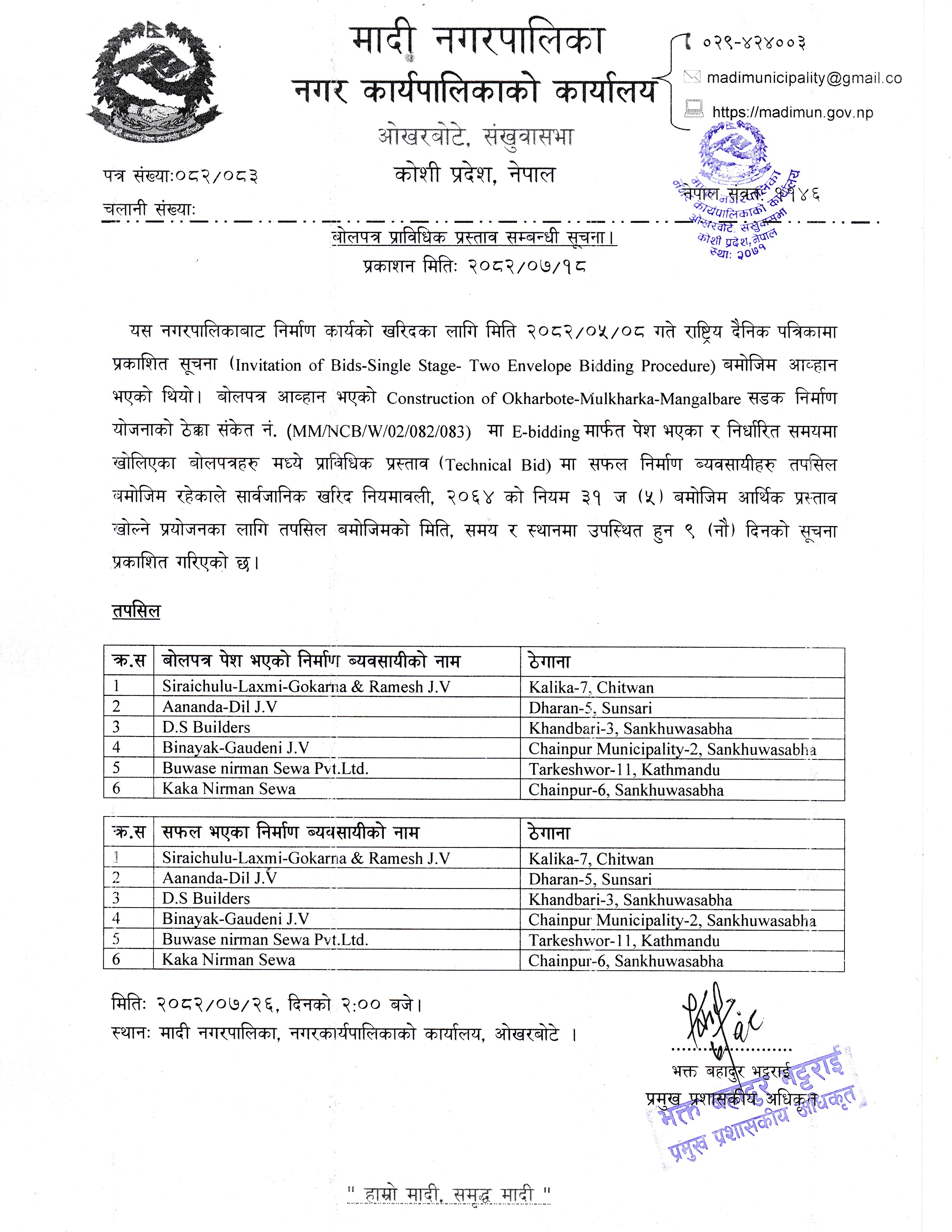 कInvitation for Bid: Construction of Okherbote-Mawadin-Nundhaki Sadak