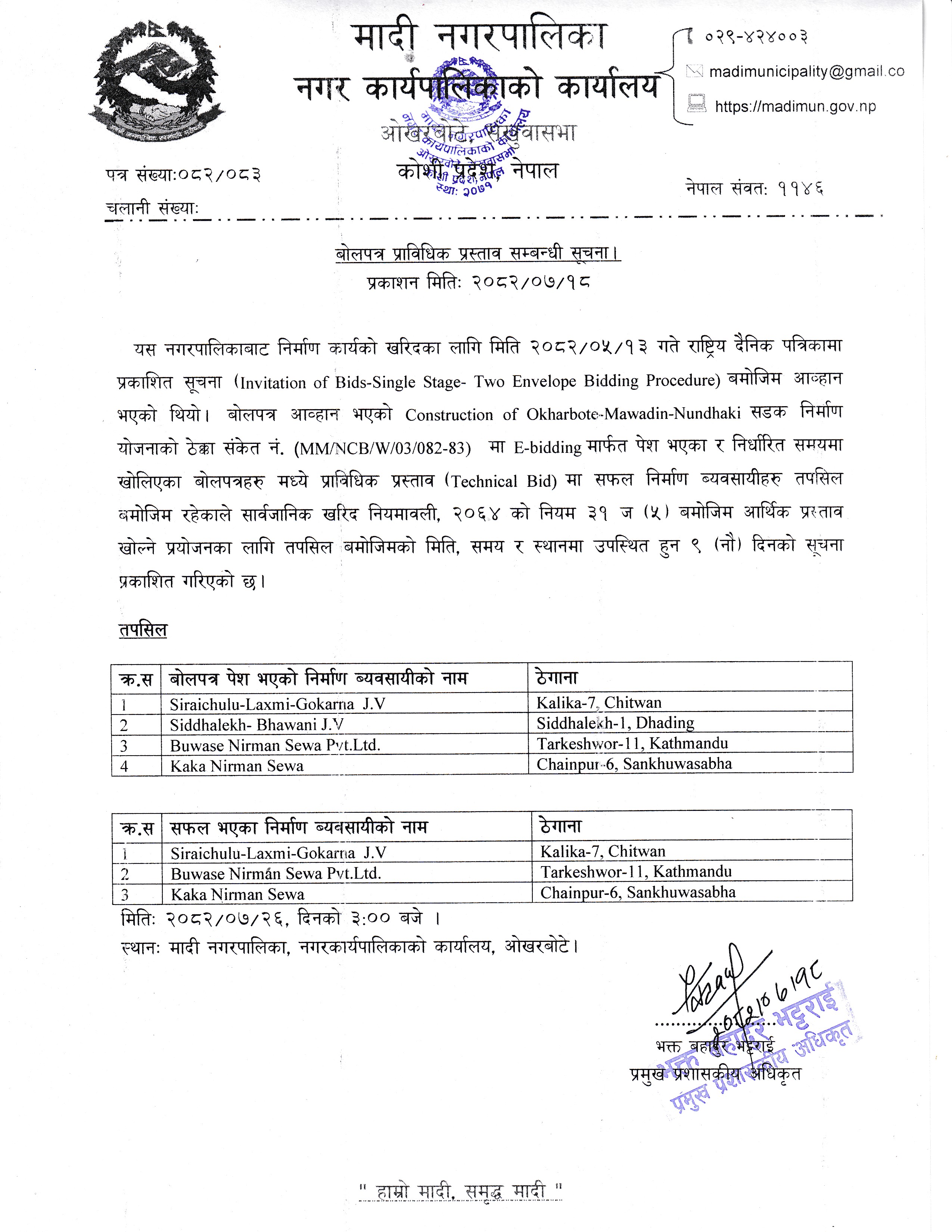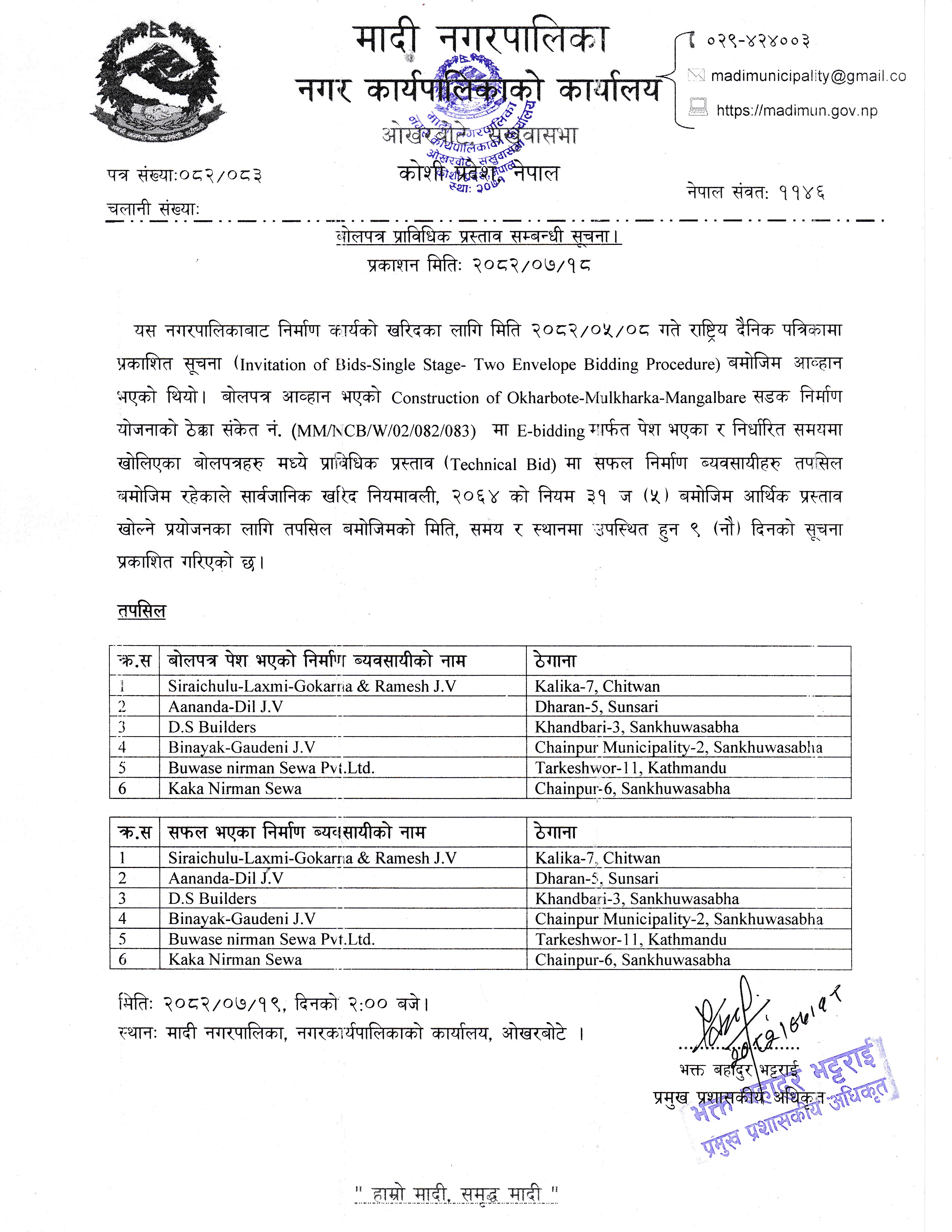 कInvitation for Bid: Construction of Okherbote-Mawadin-Nundhaki Sadak